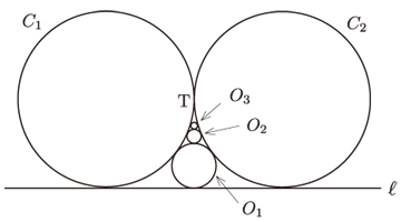 点で外接している2個の等円 , が直線 ℓにも接しているとき,これら2個の円に外接する円列を次のように定める。『は ℓに接し,は に外接する()』元の2個の円の半径をとするとき,の半径を求めよ。